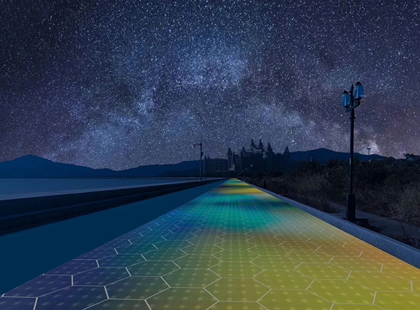 ▲光能寶盒發(fā)電地磚夜間景觀亮化效果