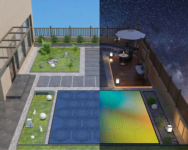 光能寶盒發(fā)電地磚設(shè)計承重高達1噸/平方米,可上人,不影響屋頂露臺、花園人行通道、人行廣場的使用空間;光能寶盒發(fā)電地磚白天發(fā)電,夜間多種景觀亮化模式,應(yīng)用場景廣泛,是高端別墅的理想選擇!